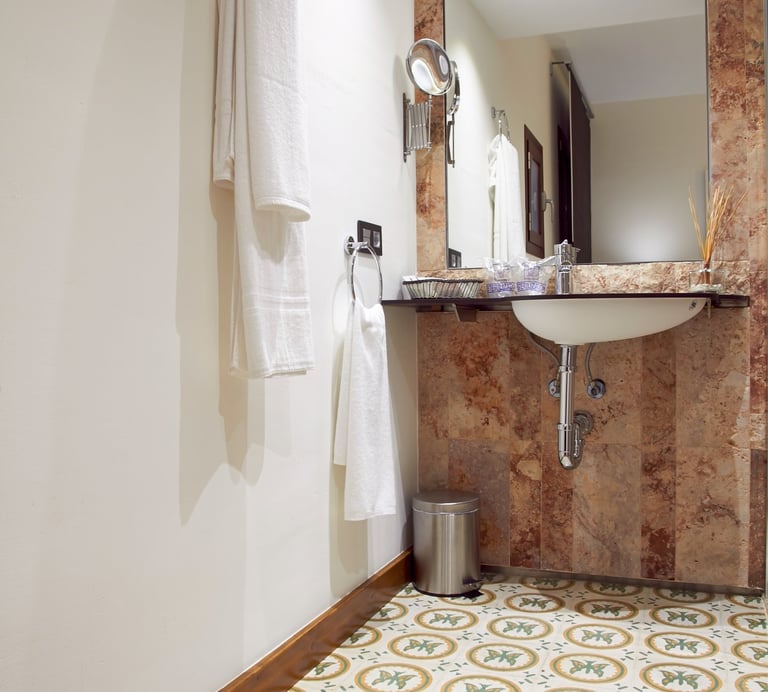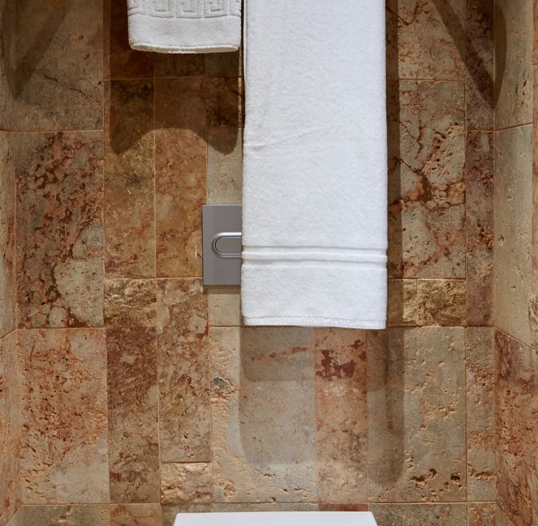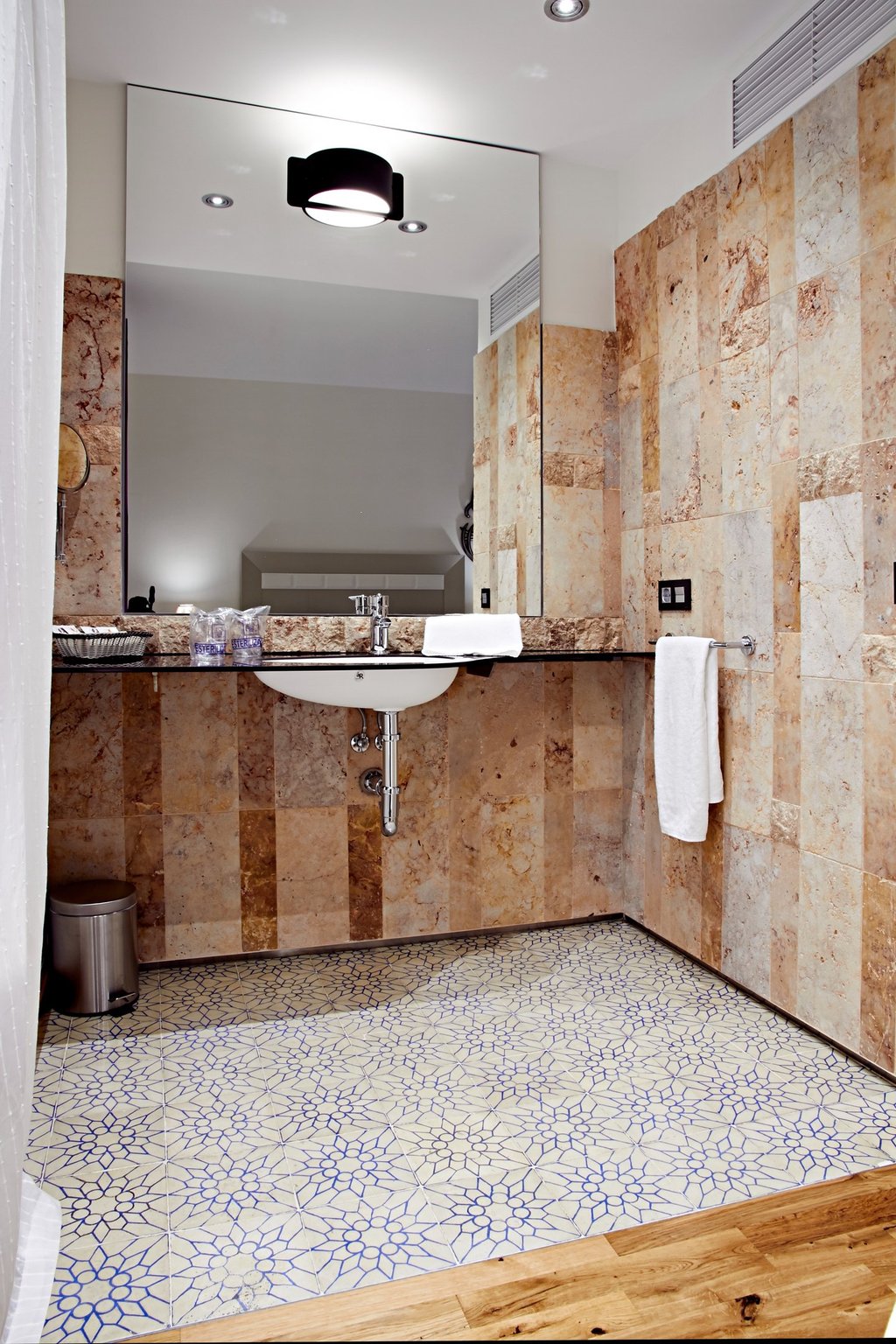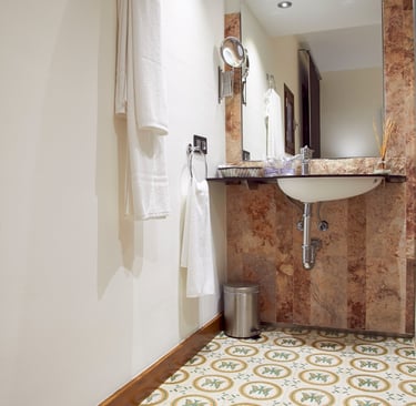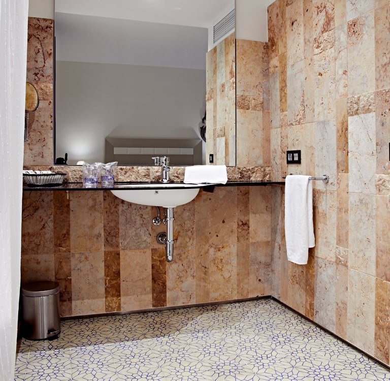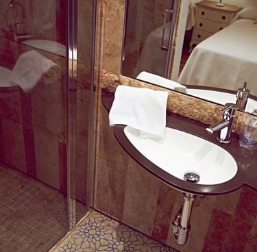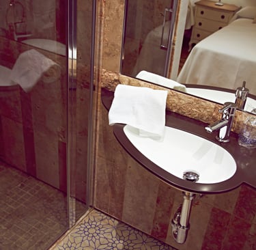 Dispone de minibar y espacio de ambiente relax. Los baños son doblemente espaciosos, con ducha de mampara de cristal y paredes de piedras revestidas