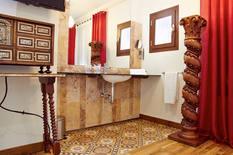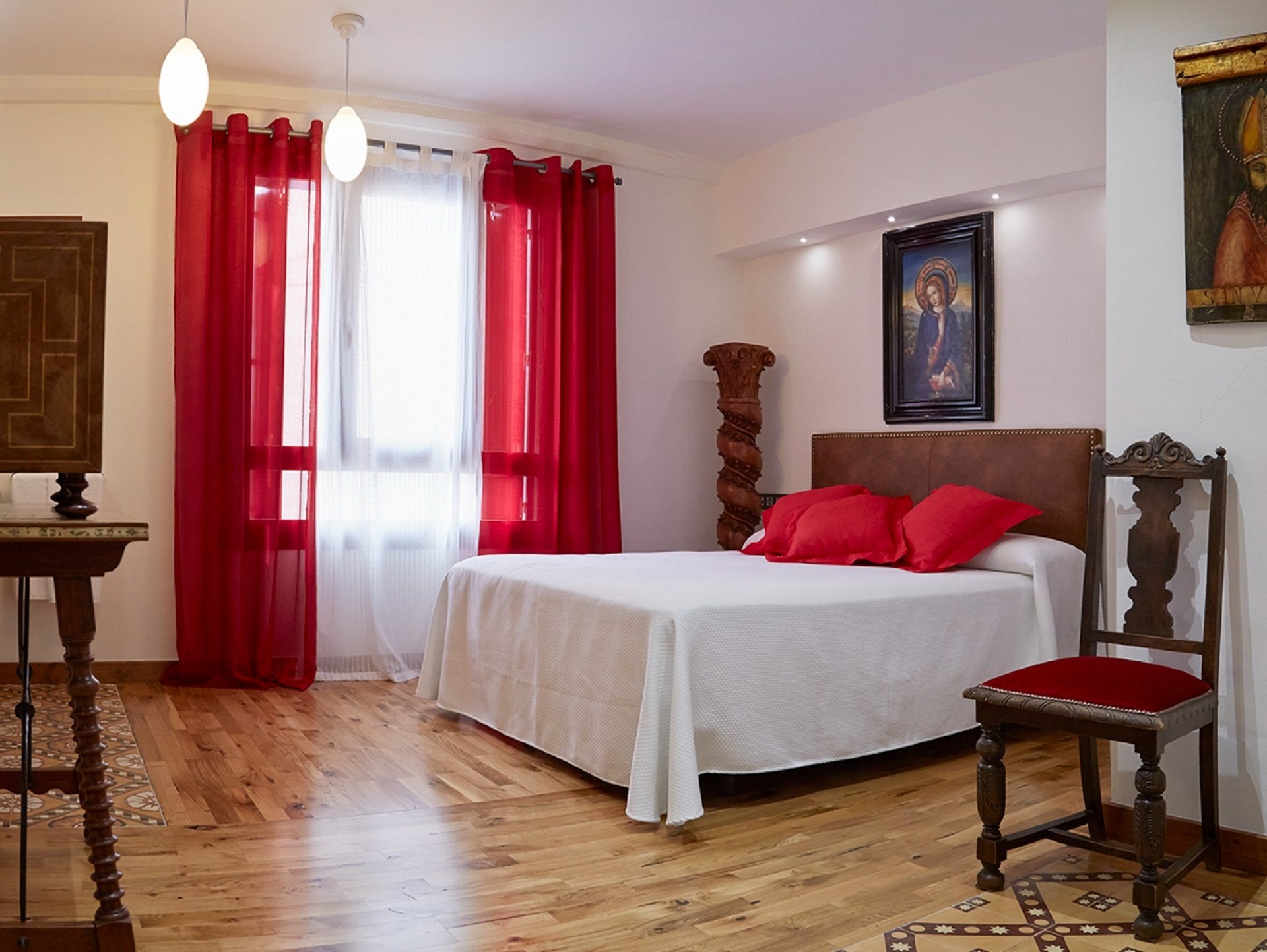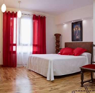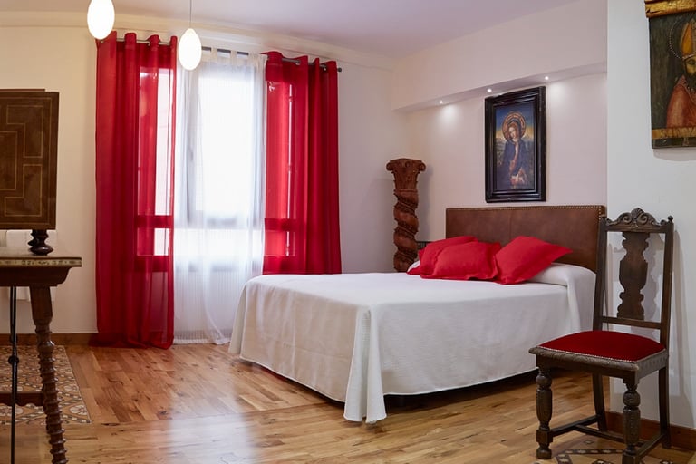 Esta habitación de nuestro hotel, le rinde homenaje, bajo el nombre de Capilla del Arzobispo Calzado, el rojo y el blanco llenan de luz un aposento donde predomina la madera de pinotea vieja de sus columnas salomónicas y su bargueño con incrustaciones de hueso