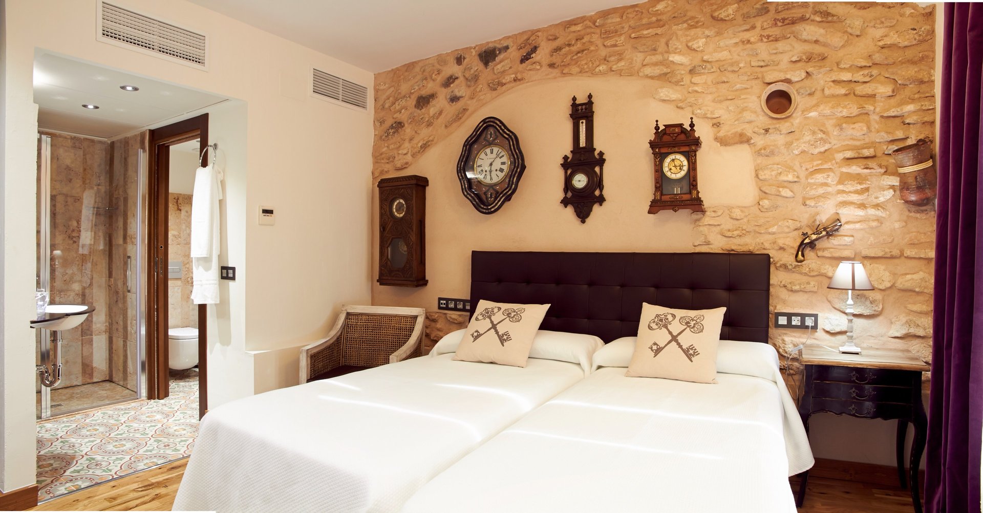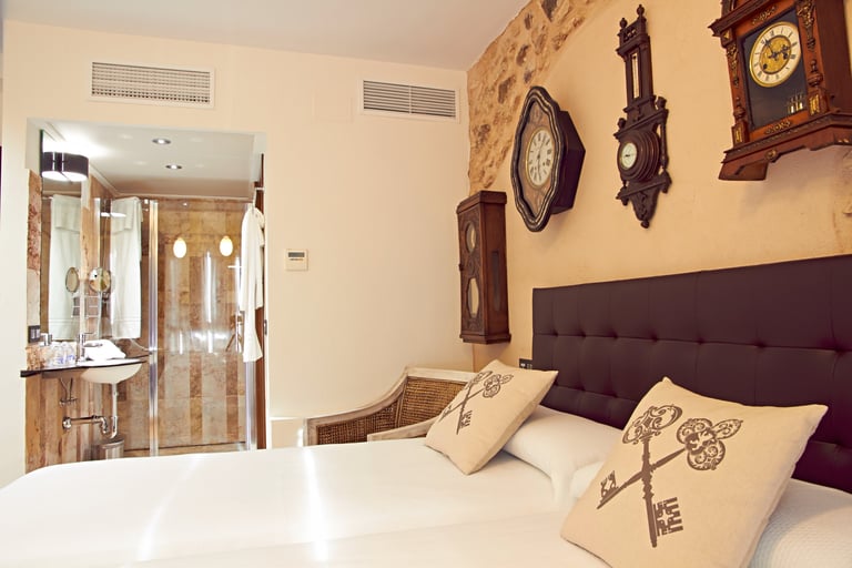 Entrar en esta habitación, es como hacer un viaje al pasado. Los cuatro relojes antiguos que presiden la pared de ladrillo envejecido son muestra de ello. Es una de las estancias cuya temática te embauca por su historia, diseño y los elementos de decoración.