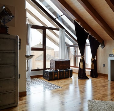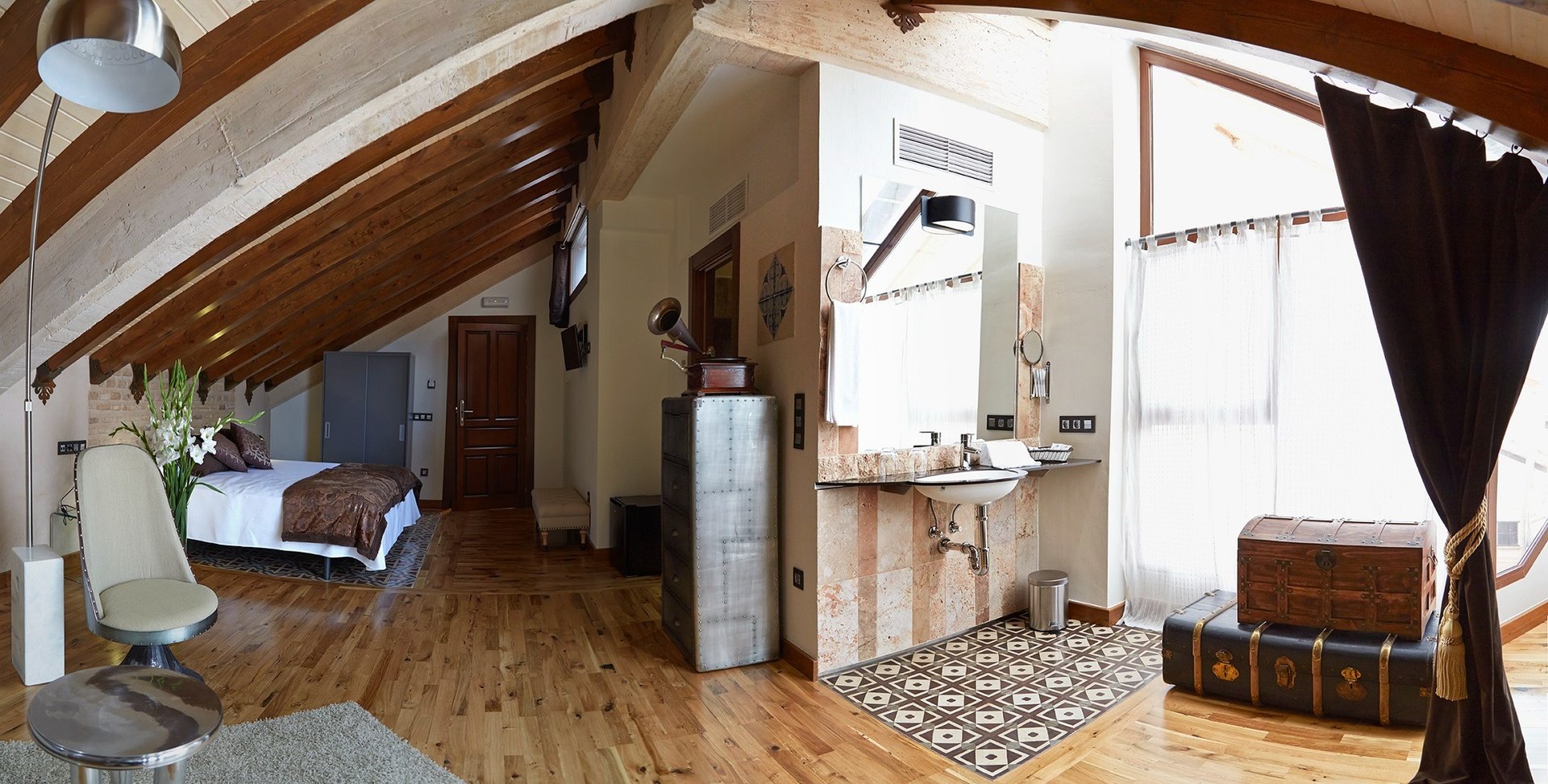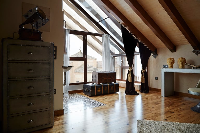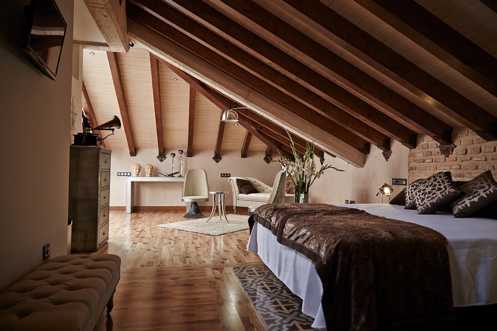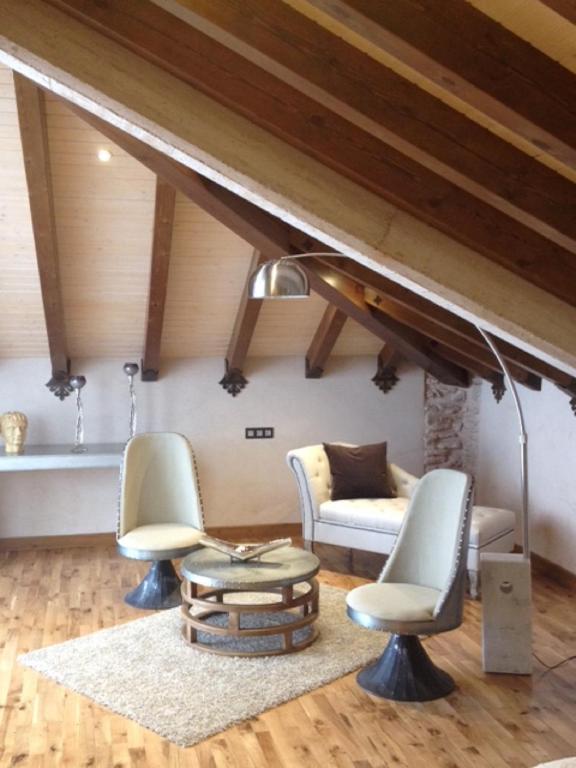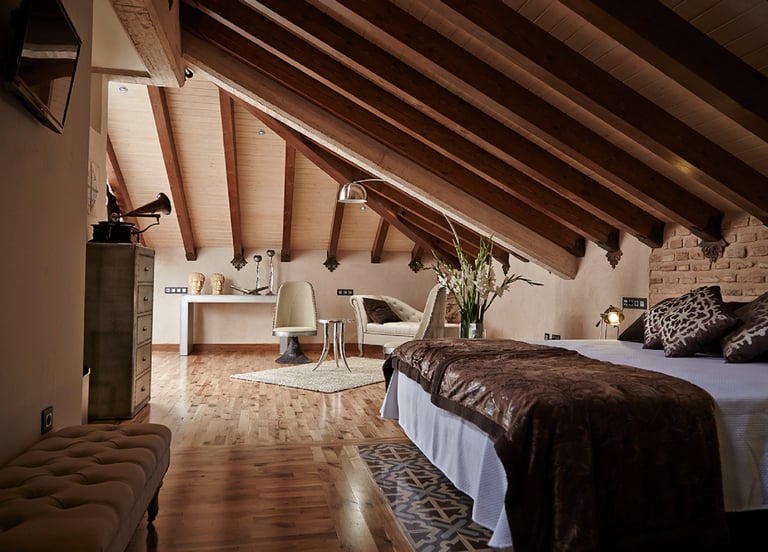 Esta Suite tiene como particularidad el techo abuhardillado, construyendo un ambiente más íntimo y acogedor. La luminosidad es una de sus notas a destacar, ya que se encuentra en la planta superior del complejo